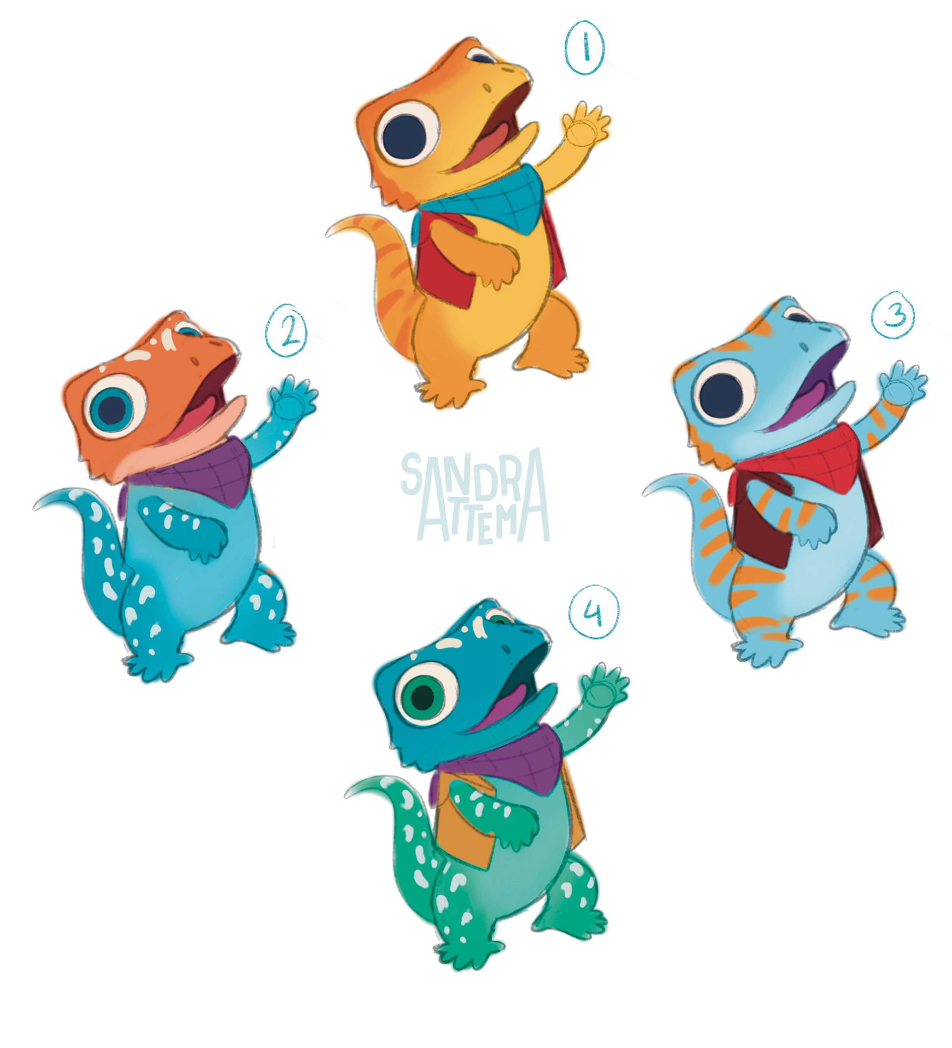 Lester needed to be a sunny cheerful fellow. A good character design has personality without standing in a scene. Therefore I gave Lester a bandana and a tiny vest. We went through several rough coloured versions to get to the right one. He needed to stand out with colour or pattern. The orange and blue colours went very well together. And we settled on the striped tail.